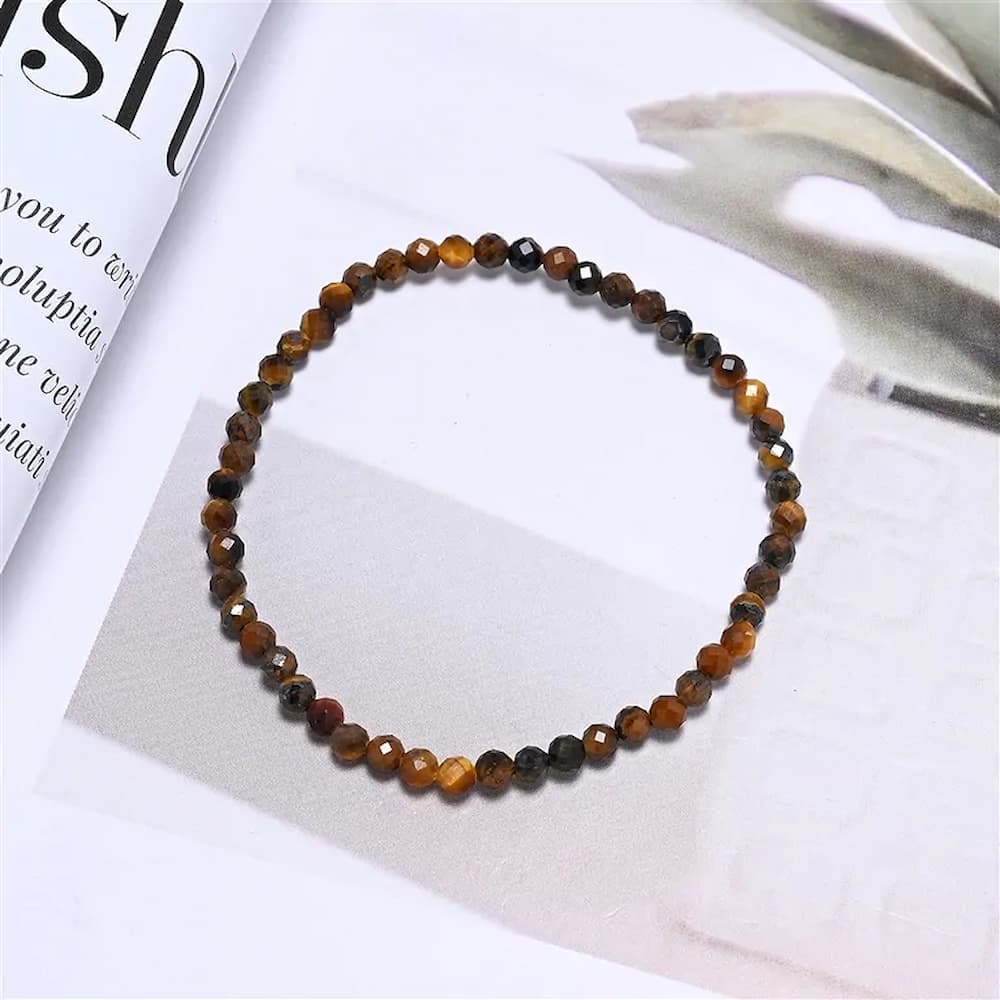 Klassieke edelsteenarmband met gefacetteerde kralen van 3 mm in goudbruin tijgeroog, geregen op elastisch koord.